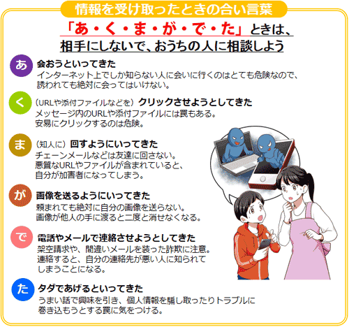 インターネット通信端末を使用していると、多くのメールやメッセージが届きますが、その中には犯罪被害やトラブルのきっかけになりうるものも含まれています。知らない人から届くメールやメッセージのうち、とくに危険なものの特徴をまとめた合い言葉が「あ・く・ま・が・で・た」です。
