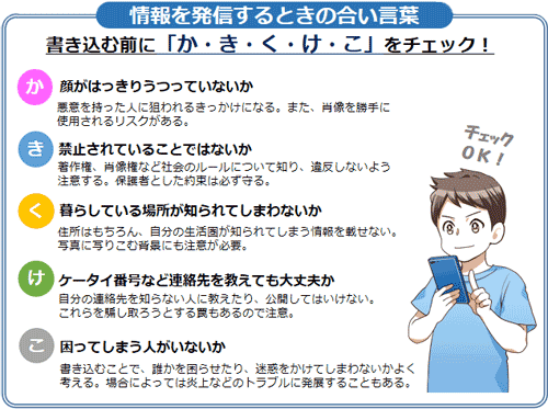 SNSや入力フォームへの投稿や書き込みをするときなど、「送信」ボタンを押す前に確認すべき事項をまとめた合い言葉が、「か・き・く・け・こ」です。
