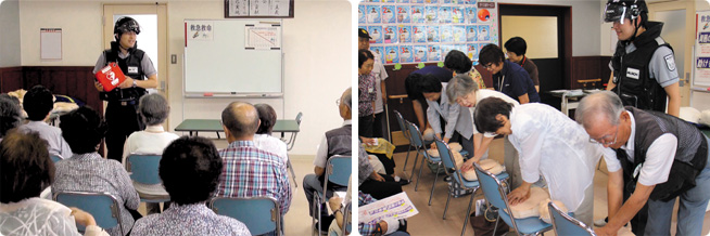- ・専用の訓練用教材を用いて心肺蘇生法の練習を行う、体験型の講座です。(ただし、実技では体力を要するため、激しい運動を止められている方には見学を勧めています。)