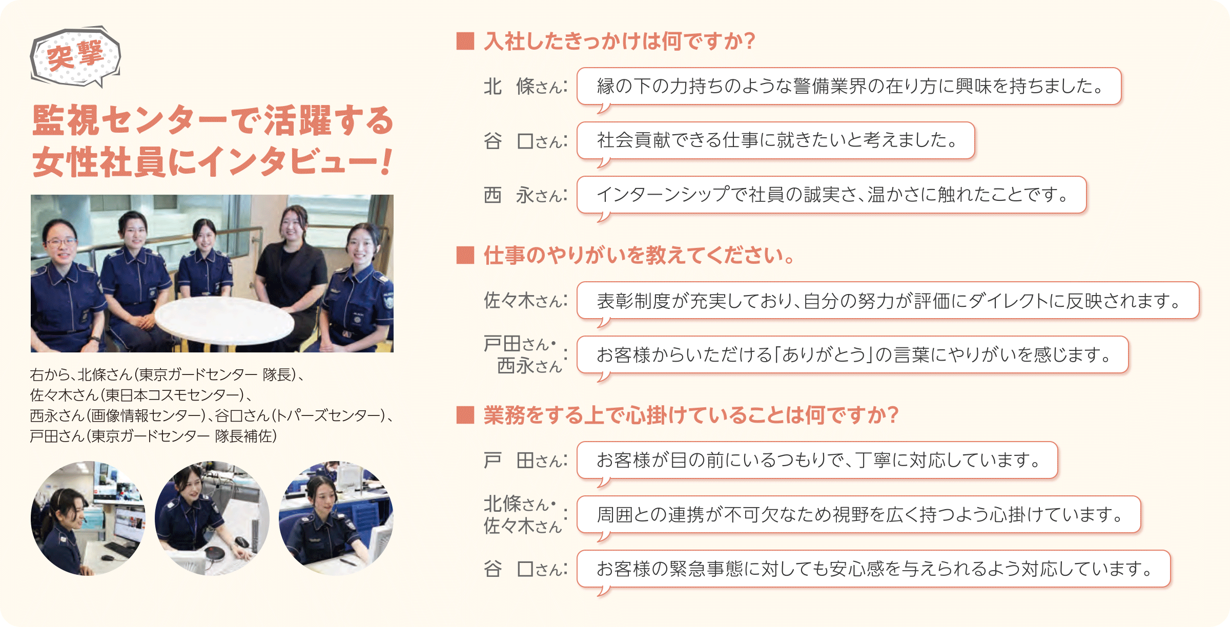 ALSOKでは女性が運用の現場でも働きやすくなるよう、また活躍の幅を広げられるよう、職場環境の整備に努めています。