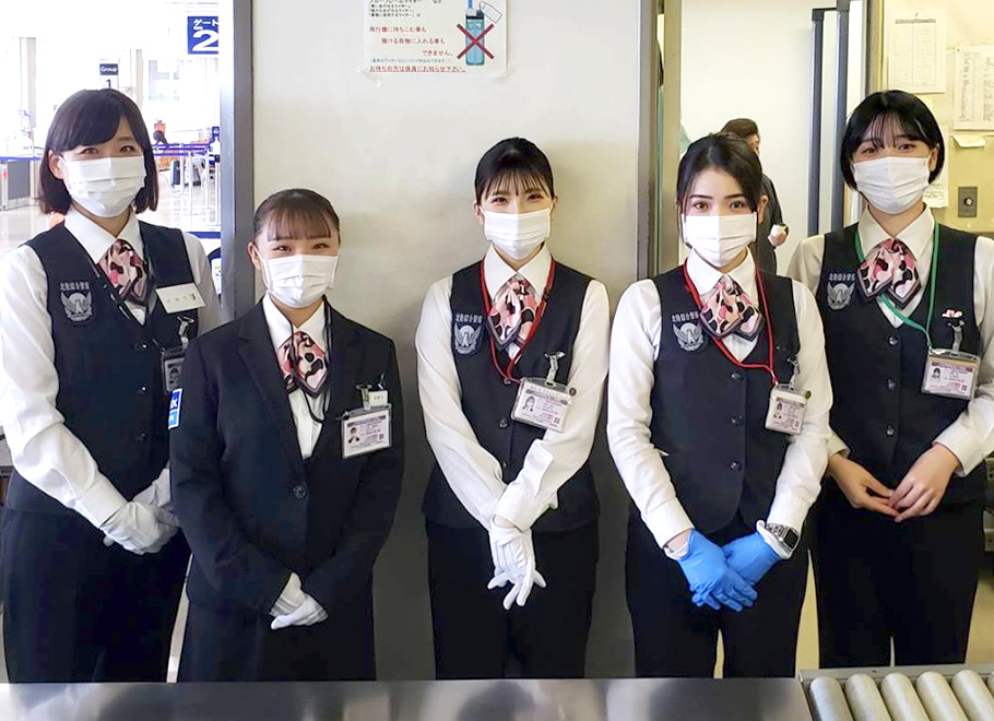 空港保安検査業務は、グループ会社で数少ない女性警備員が活躍する職場です。北陸綜合警備保障が警備する小松空港では、現在約20人が旅客および機内持込手荷物を検査する保安検査場、並びに預け入れ手荷物検査場で勤務しています。年齢は20代が最も多く、多士済々のメンバーが集う、忙しい中にも笑顔の絶えない活気ある職場です。2023年4月には、コロナ禍で運休が続いていた国際線が3年ぶりに一部再開となり、搭乗される方の安全で楽しい空の旅を確保するため、日々検査業務を遂行しています。