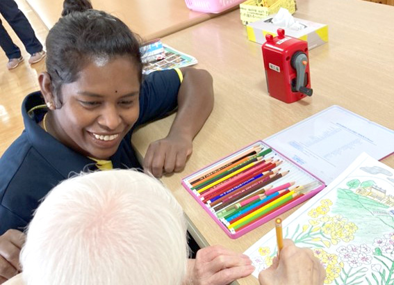 介護事業では外国籍の社員も多く活躍しています。特に外国人技能実習生や外国人特定技能実習生の受け入れに際しては、民族・宗教・食習慣・働くための基礎知識などのヒアリングを事前に行い、関係部署間で情報を共有することでスムーズな受け入れが可能となっているほか、日本語の理解度に合わせて研修資料にルビや英語訳を加えるなどの対応を取り、国籍関係なく、周囲の社員やご利用者様と良好な関係を築いています。