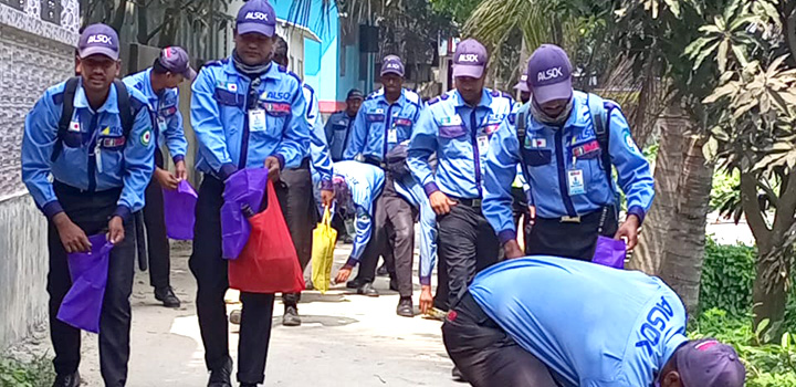 2022年に設立したALSOKバングラデシュでは、顧客である日系企業で働く方々が円滑に勤務できるよう、現地で採用した社員に対する教育に力を入れています。勤務地周辺の道路では、地域への感謝の気持ちも込めて清掃活動を実施していますが、職場環境を常に綺麗な状態に保つことで不審物を迅速に覚知できるという利点もあります。