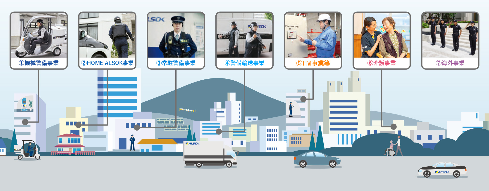 全国・アジア各国に展開するALSOKグループでは、セキュリティ事業を軸としながらさまざまな特色あるサービスを提供することで、各地域に寄り添い、地域の抱える課題解決に貢献しています。