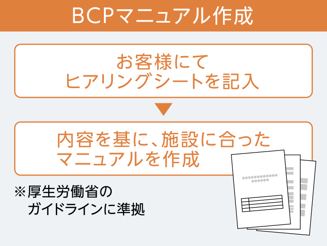 2024年4月より、介護施設におけるBCP (事業継続計画)の策定が義務化されたことを受けて、「介護事業所向けBCPサービス」を提案し、BCPマニュアル作成業務を受託しています。