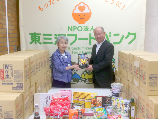 防災の日を迎えるにあたり、所属員が自主的に自宅の備蓄品の点検を行い、消費期限が近い備蓄品等を持ち寄って、事業所として地域のフー ドバンクに寄贈しています。期限を迎えた備蓄品のロスを防ぐだけでなく、地域貢献の一環としてフー ドバンク等で活用いただいています。