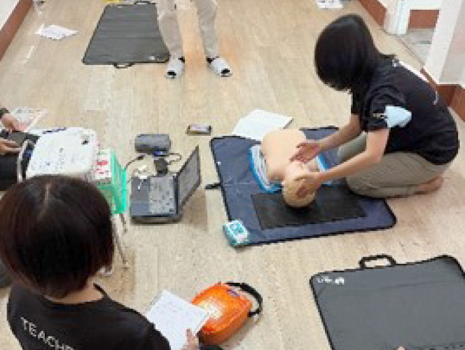 AED普及活動の一環として、幼稚園の 先生向けにCPR(心肺蘇生法)講習を実施しています。現地の医療関係機関と協力し、子どもたちの安全を守る環境を提供しています。