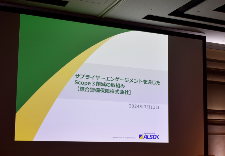2024年3月には環境省主催の「脱炭素経営フォーラム」にも参加し、取引先と協働でCO₂排出量算出における課題や実施した対策について発表しました。本事業を通じて当社のサプライヤー向けガイドラインを策定することができ、さらに脱炭素経営の促進に向けたロールモデルを確立することができたため、環境にも貢献するサステナブルな警備会社として、今後はより幅広いサプライヤーの皆さまとともに、バリューチェーン全体でのCO₂排出量削減に取り組んでまいります。