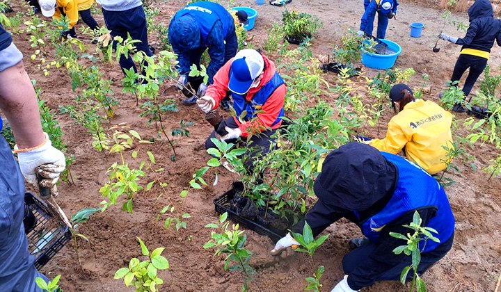 ALSOKの植樹活動は、会社の創立50周年記念事業をきっかけとして、2015年に千葉県で始まりました。2021年からは新たに「(公財)鎮守の森のプロジェクト」に参加し、植樹活動に取り組んでいます。福島県南相馬市で開催された植樹祭に社員が参加して植樹を行い、さらに市民の方々とも交流を深めています。