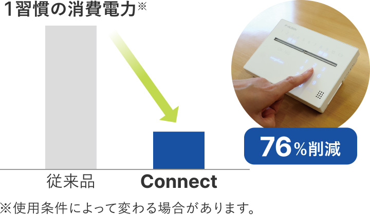 また、RoHS指令への準拠や、省エネルギー化、省資源化、リユース・リサイクル、長寿命化などを意識した設計について規定した社内ガイドラインとして「環境配慮設計に関わるガイドライン」を策定しています。本ガイドラインに基づき、お取引先と協力して製品を設計・開発する際の環境配慮を検討しており、2023年4月に発売された「HOME ALSOK Connect®」は、従来製品と比較して約1/4以下の消費電力※となっています。