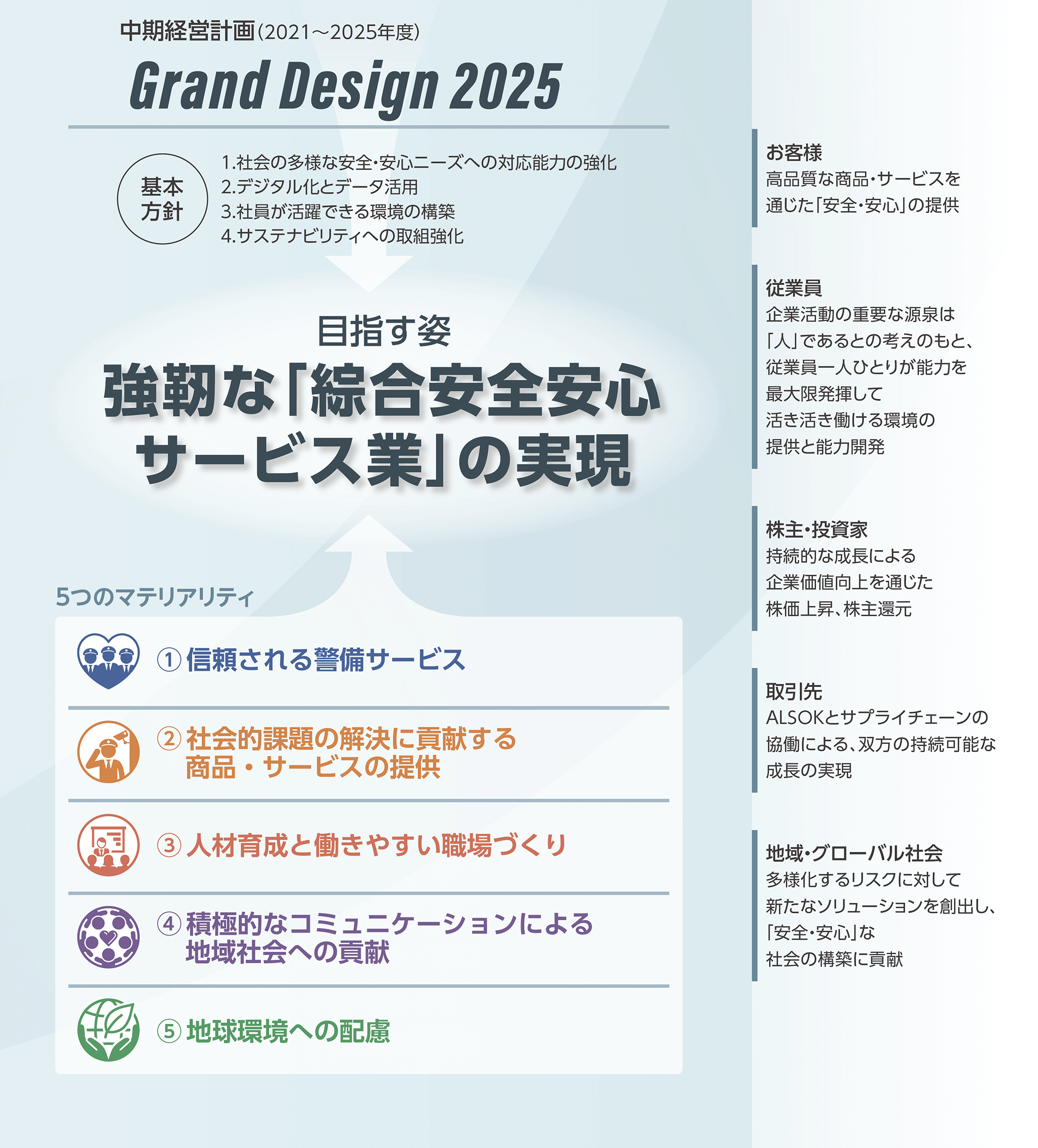 創業以来、高品質なセキュリティサービス等を提供し続けてきたALSOKグループは、「人材力」や「組織力」、そして「課題解決力」が大きな強みです。めまぐるしく変化する内外情勢の中、お客様と社会の「安全・安心」を確保するための新たな価値創造と持続的成長を実現し、すべてのステークホルダーの皆さまの期待に応えていきます。