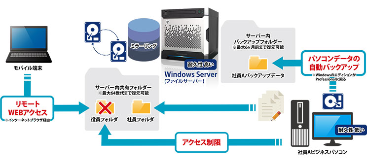 サーバーという強固なバックアップ媒体がデーターを集中管理し、組織全体で共有することができます。サーバーに保存されたデーターは、ミラーリング機能によりさらに安全性が高まります。