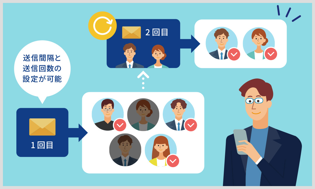 安否確認メールや緊急連絡メールが配信された後、応答が無かった社員に対して再度メールを送信します。お客様の運用に応じて、送信間隔と送信回数の設定が可能です。