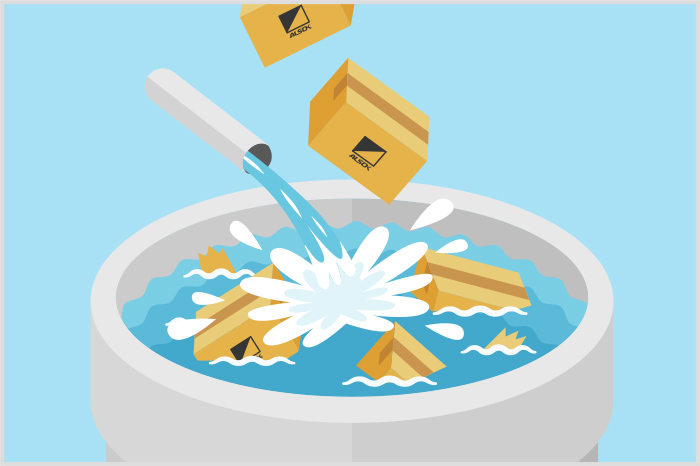 未開封のまま箱ごと溶解処理機に落下させ、強い水流で機密文書を溶かします。