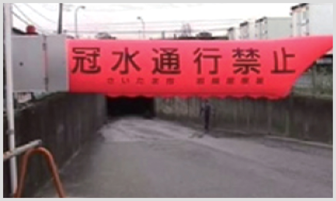 冠水発生時にバルーンを膨らませることで車両の進入を抑制する遮断機です。柔らかい形状のため車両を傷つけるリスクは低く、遮断状態においても緊急車両は低速で通過できます。