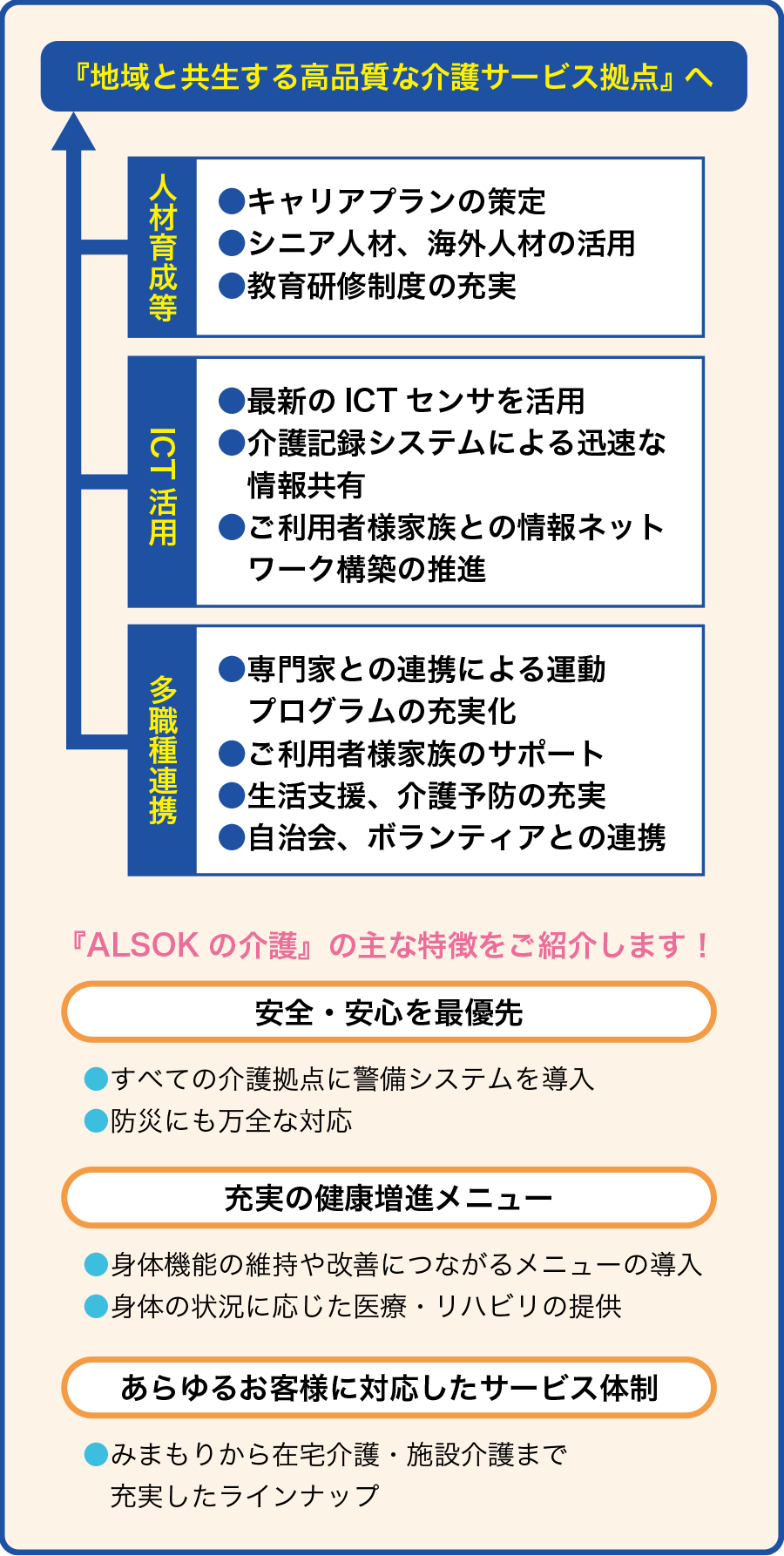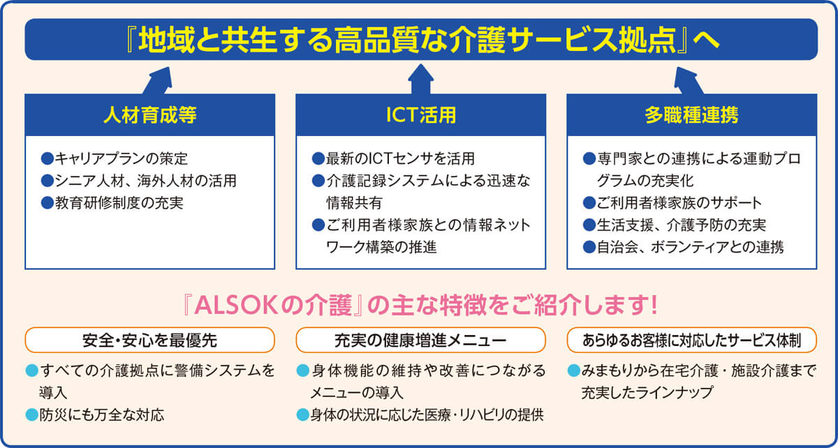 2020年10月1日、ALSOKは、「ウイズネット」、「HCM」、「ALSOKあんしんケアサポート(介護事業部門)」及び「あんていけあ」の4社を統合致します。新たな商号は「ALSOK介護株式会社(※)」です。