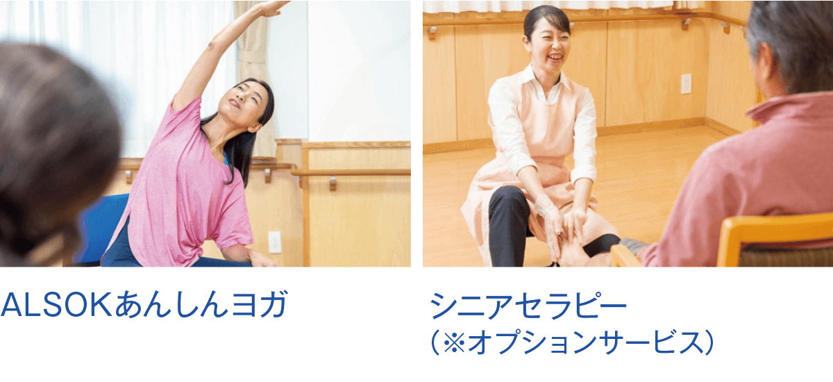 ALSOKの介護では、オリジナルの健康増進プログラムを取り入れています。NõA(ノーア)エクササイズ、いきいきリズム体操、ALSOKあんしんヨガ、シニアセラピーなどのアクティビティは入居者様、ご家族様ともにご好評いただいております。
