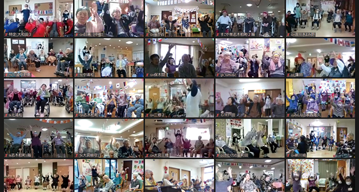 コロナ禍で高齢者の健康不安が高まる中、「いかに体を動かす習慣を継続するか」という課題を解消するため、オンライン会議システムを利用した「リモート運動教室」を開催中。日頃の運動も、さらに一体感や活気がうまれ、大変好評を得ています!
