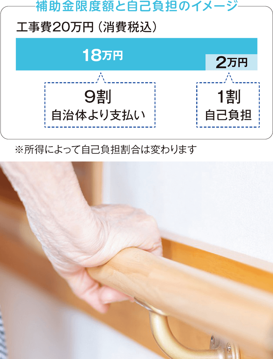 要支援者・要介護者が、自宅で安心して暮らせる環境を整えるための改修工事で、介護保険を利用すると20万円までの工事に対して補助金が受けられます。※20万円の9割(18万円)が上限