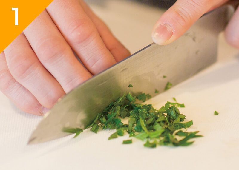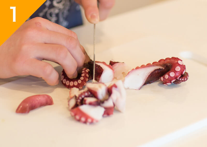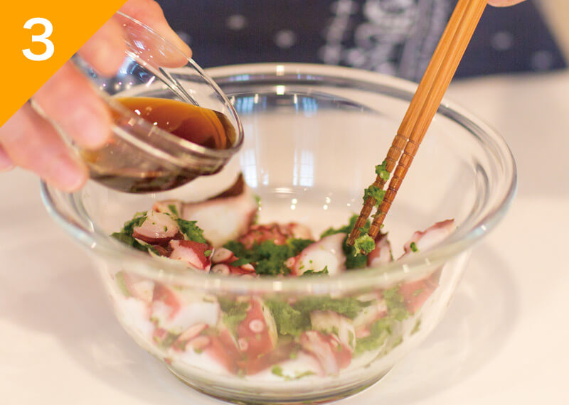 ゆでタコはひと口大に切り、大葉は粗みじんに切る。