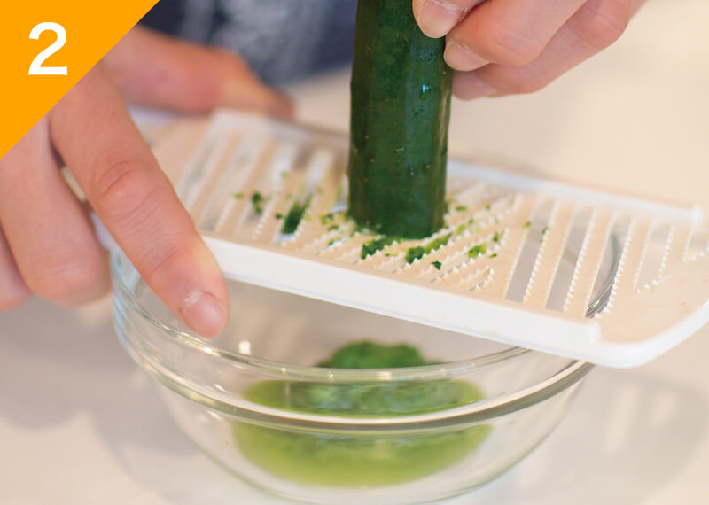きゅうりはすりおろし、キッチンペーパーにのせて軽く水気を切る。