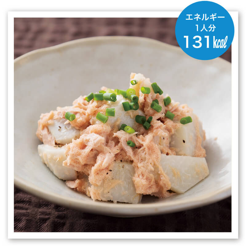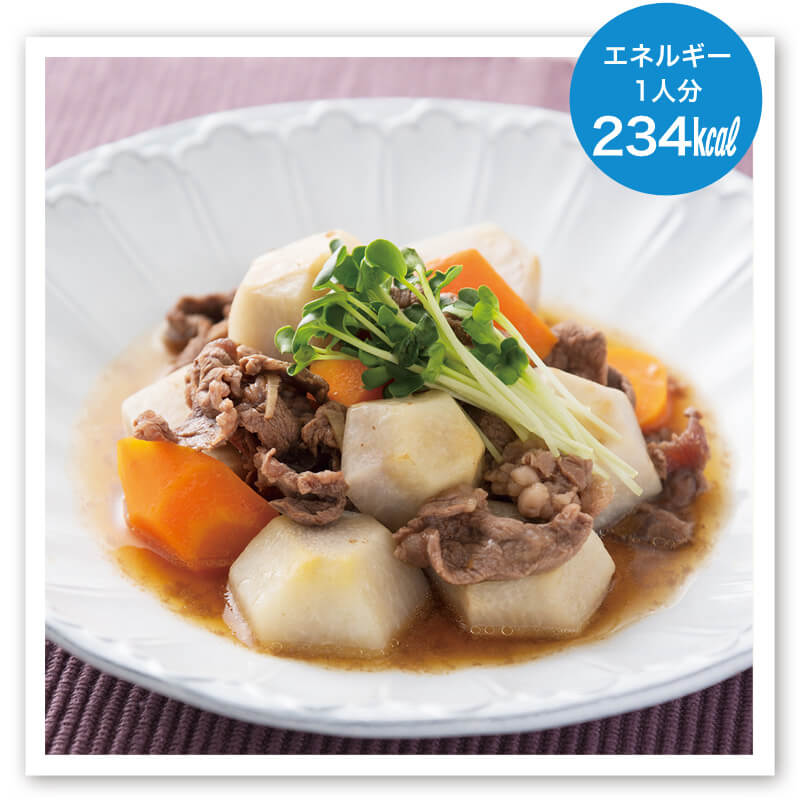 里芋は100gあたり58kcalと他の芋類に比べて低カロリーな食材です。里芋特有のねっとりとしたぬめりは食物繊維の一種によるもので、腸内環境を整え、血圧やコレステロールを下げる働きがあるといわれています。たんぱく質の代謝を助けるビタミンB6も含んでいるため、たんぱく質が豊富な肉や魚との相性もピッタリです。