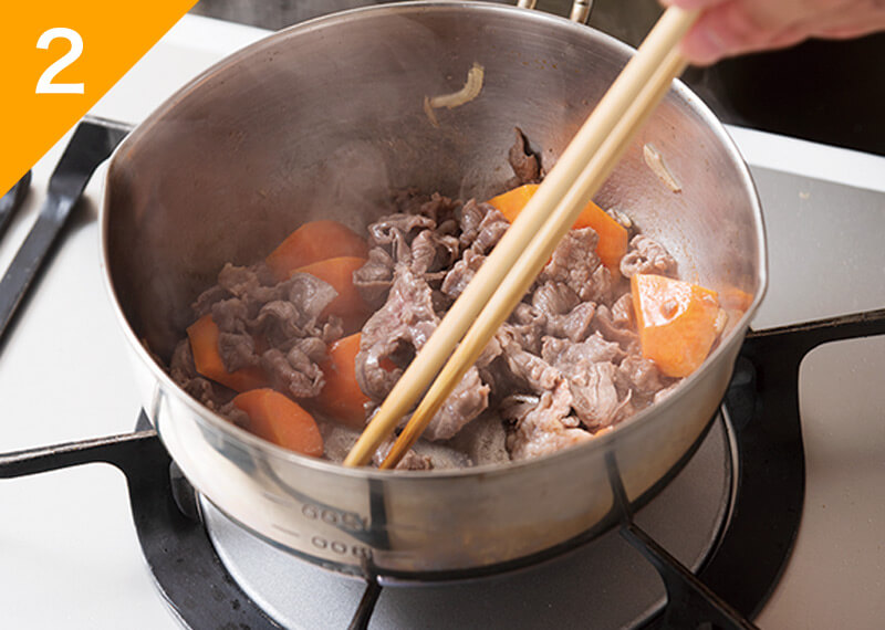 鍋にごま油と生姜を入れて中火にかけ、生姜の香りがたったら牛肉と酒を入れて炒め、にんじんを加える。