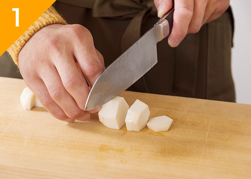 里芋は皮をむいて、食べやすい大きさに切り、電子レンジ600Wで3分加熱する。