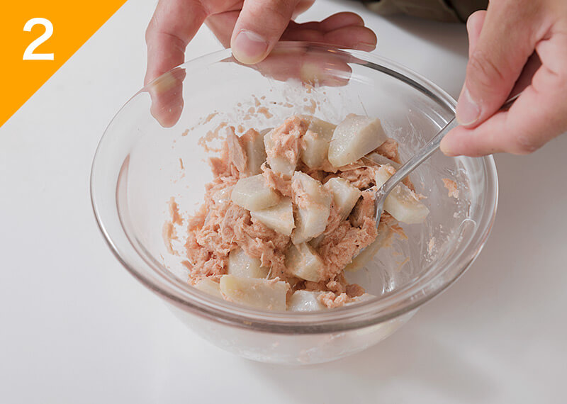 水気を切ったツナと(A)をボウルで混ぜ合わせ、(1)を加えて和える。