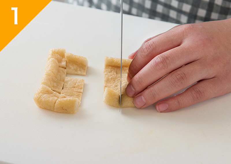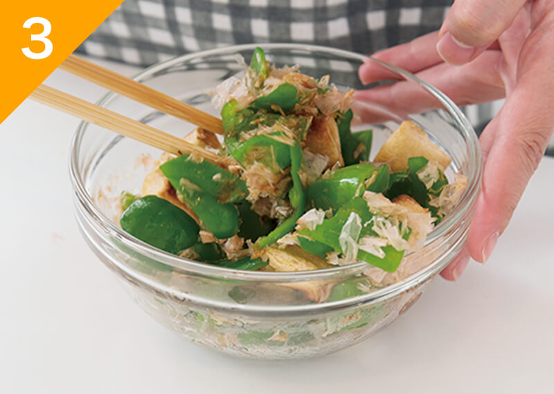 ピーマンは縦半分に切って種を取り、ひと口大の乱切りにする。油揚げは2cm角に切り、トースターで2~3分加熱する。