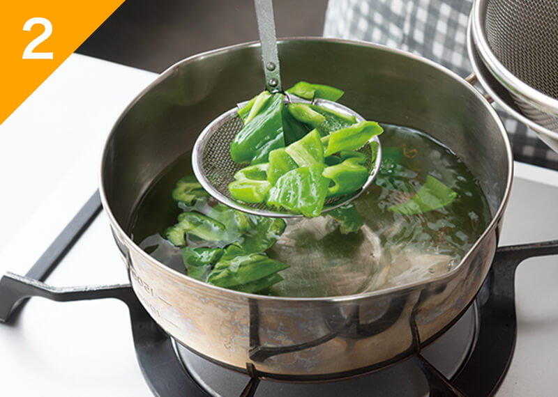 鍋に湯を沸かし、塩を一つまみ(分量外)を加え、(1)のピーマンを10〜15秒ほど湯通しする。