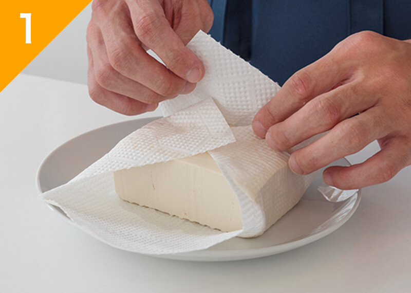 豆腐はキッチンペーパーで包んで皿にのせ、電子レンジ600Wで3分加熱したのち食べやすい大きさに切る。