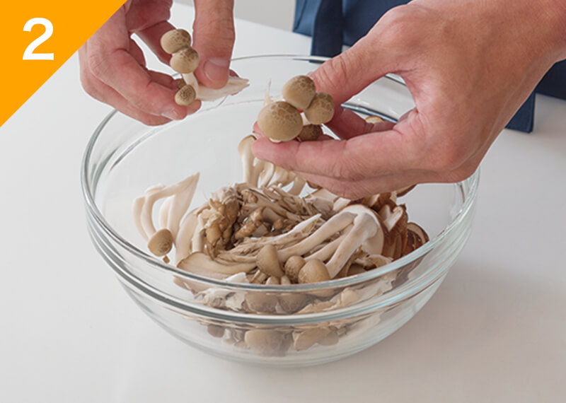 舞茸としめじは石づきをとり手でほぐし、しいたけも石づきをとりスライスして(A)とともに耐熱容器に入れる。ラップをして電子レンジ600Wで4分加熱する。