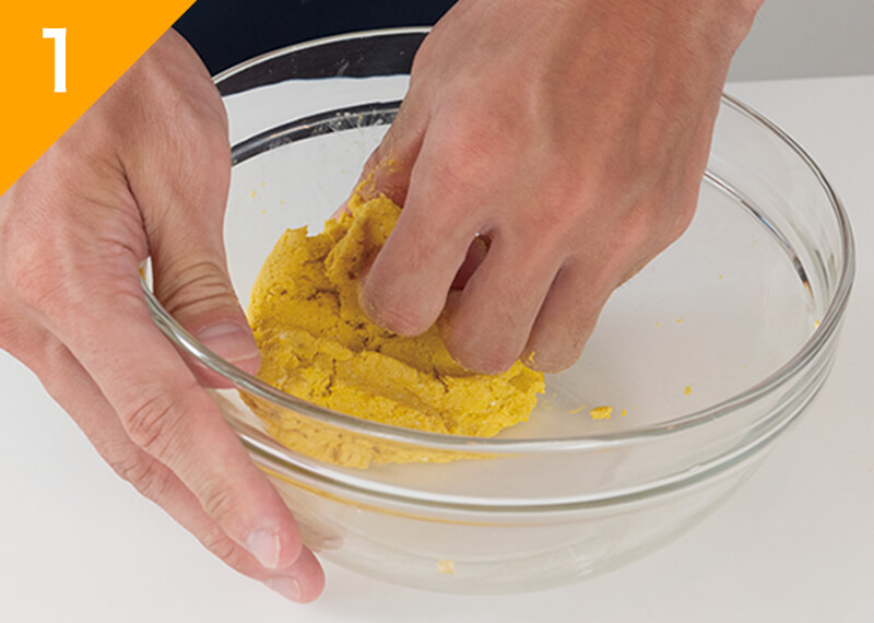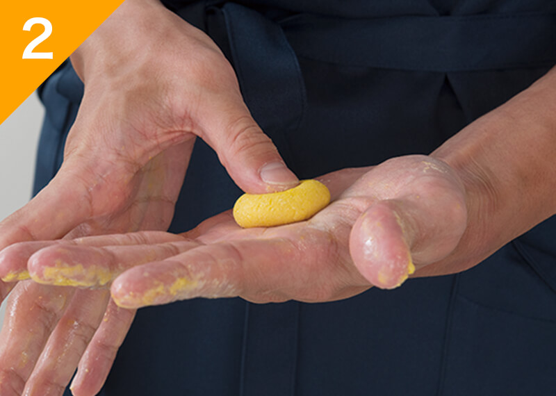 耳たぶくらいの柔らかさになったら10等分にして丸めて、真ん中を少しくぼませる(パサついている場合は水を少量加える)。