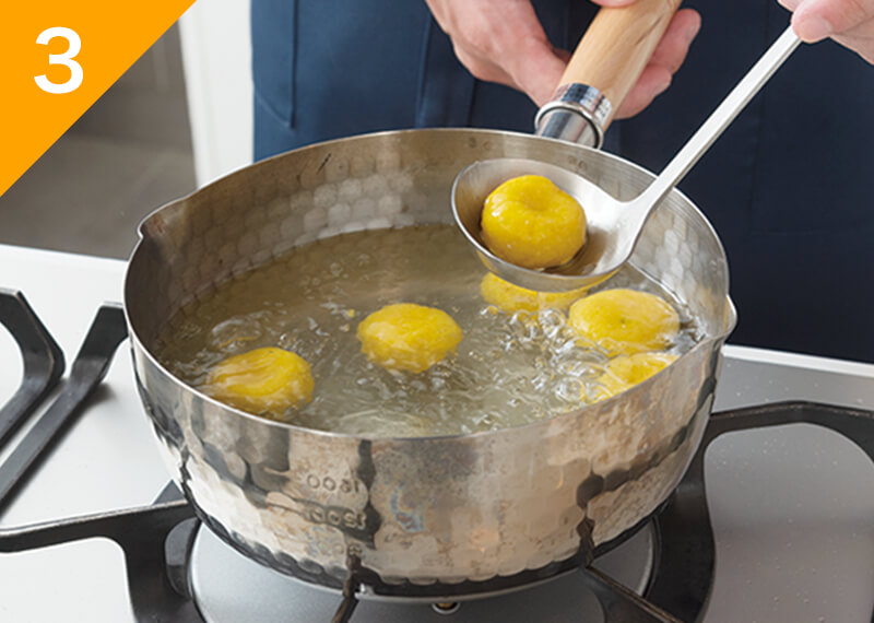 鍋に湯を沸かし、(2)を入れ、水面に浮いてきたらすくって冷水にとる。皿に盛り、(A)をのせる。