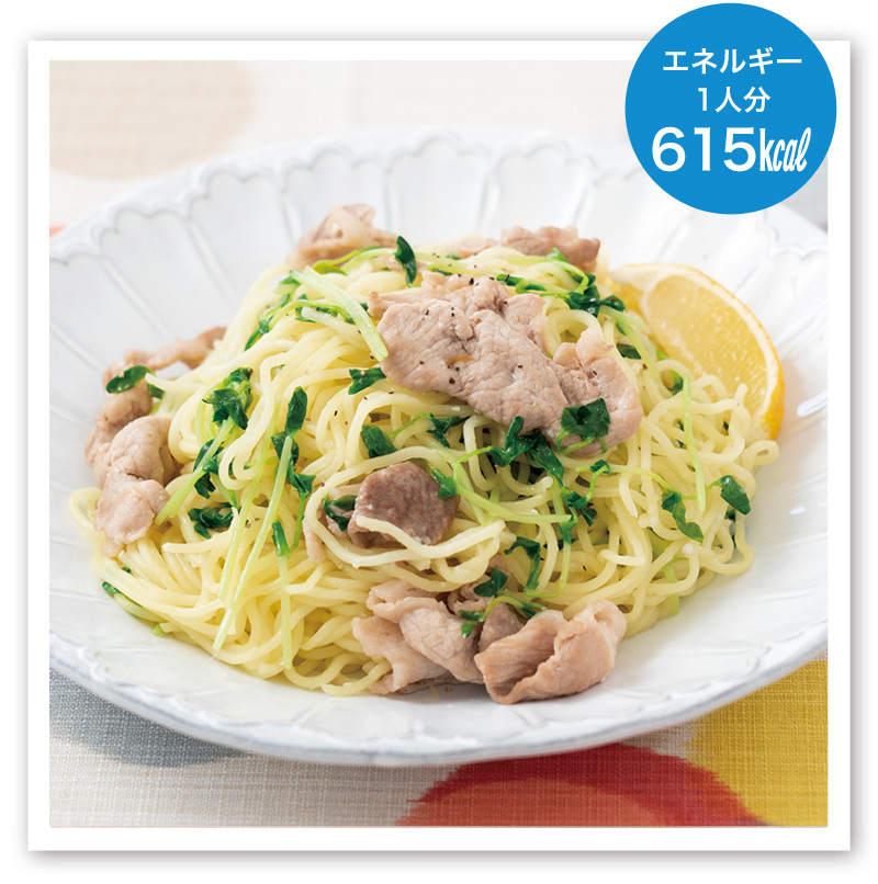 麺がほぐれたら半分の長さに切った豆苗を加えて全体を混ぜ合わせる。仕上げに黒こしょうをかけて器に盛り、レモンを添える。