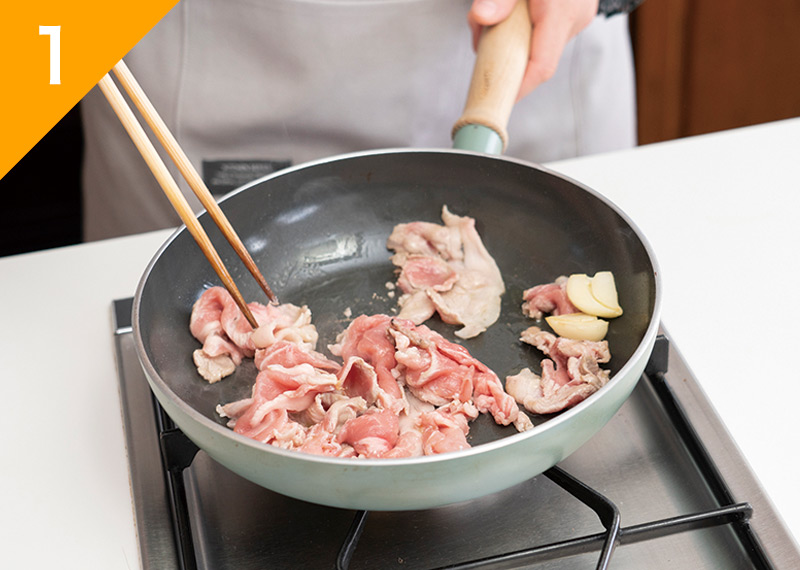 フライパンに、にんにくとオリーブ油を熱し、豚肉を炒める。