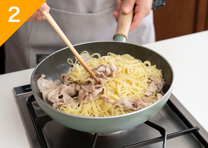 豚肉の色が変わったら中華麺、塩糀、水の順に加えて麺をほぐすように炒める。