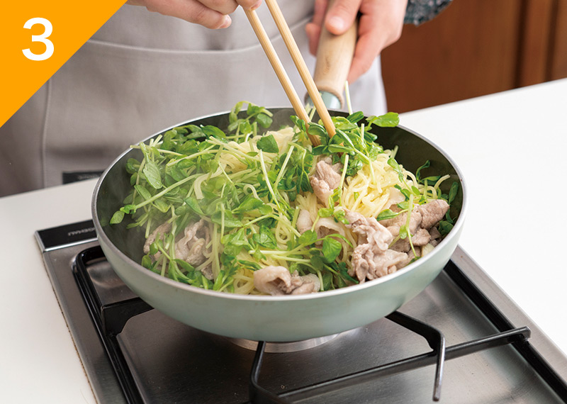 栄養が偏りがちな焼きそばに豆苗を加えるだけでビタミンや食物繊維を手軽にプラスし、見た目も鮮やかに!
