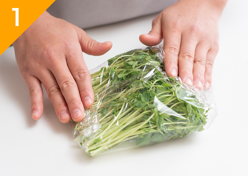 豆苗は根元を切ってふんわりとラップに包み、電子レンジ600Wで1分加熱し、半分に切る