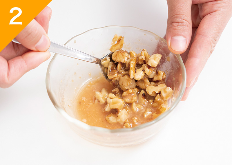 耐熱容器に(A)を混ぜ合わせ、ラップをかけずに電子レンジ600Wで40秒加熱する。粗く刻んだくるみを加えて混ぜ合わせる。