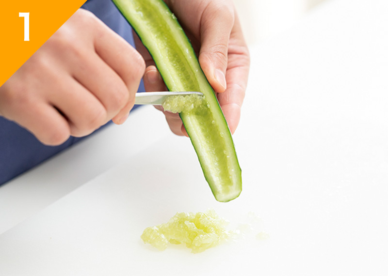 きゅうりは縦半分に切り、スプーンの柄を使って種をこそぎとり、1㎝幅に切る。ミニトマトはへたを取り、半分に切る。