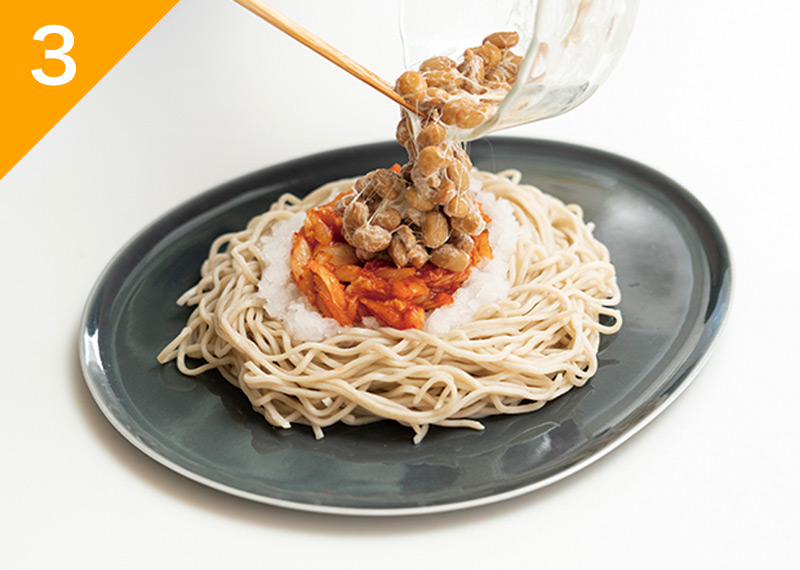 器に(1)のそばをのせ、大根おろし、キムチ、納豆、温泉卵の順にのせ、混ぜ合わせた(A)をかけ、カイワレ大根を添える。
