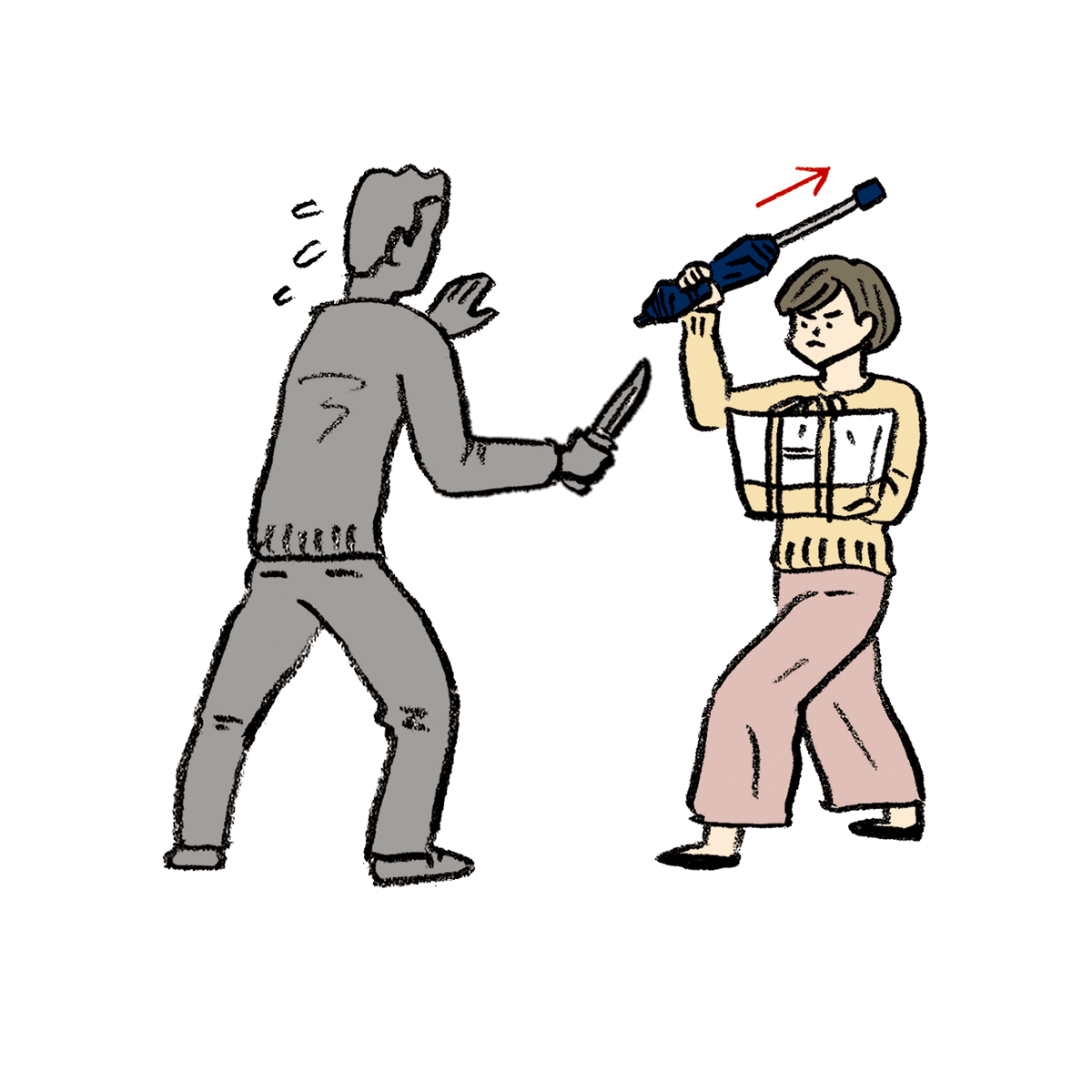 傘の柄で、相手の手首や指を打ちます。相手がひるんだら、すぐに逃げましょう。