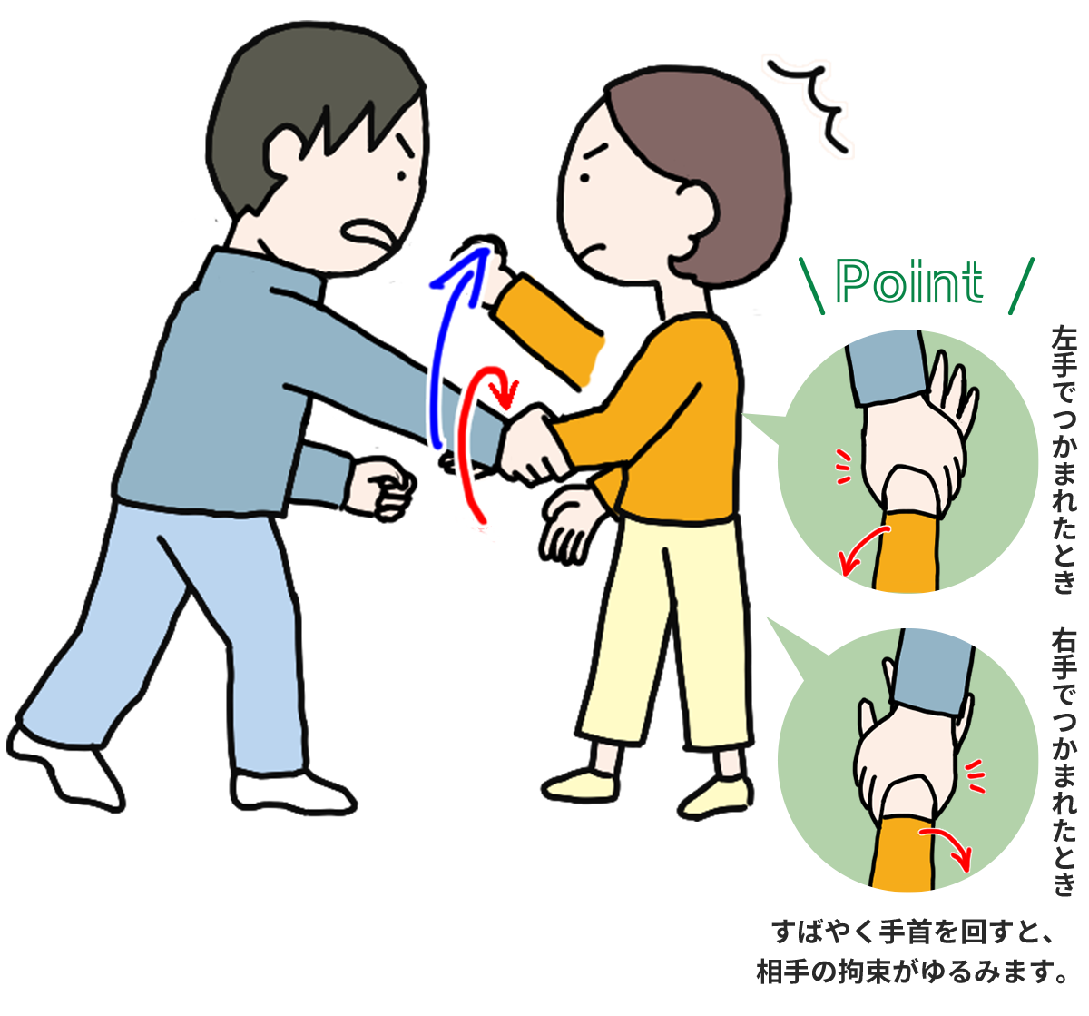 相手の親指がある方へ手首を回転させながら、すばやくひじを折り曲げます。