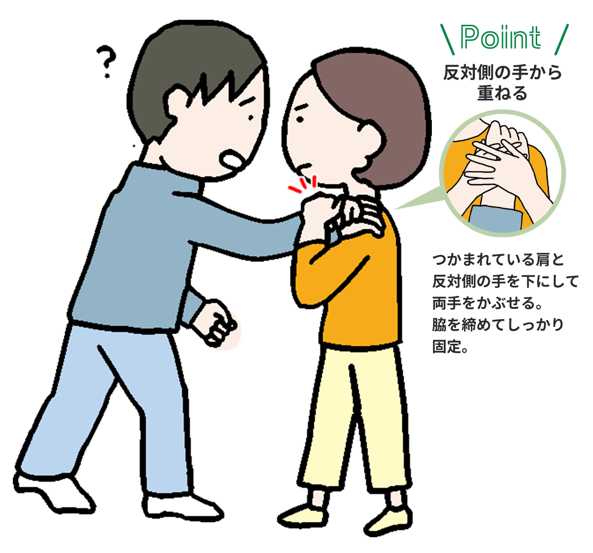 右手で左肩をつかまれたときは、相手の手を包み込むように、右手、左手の順で両手をかぶせます。