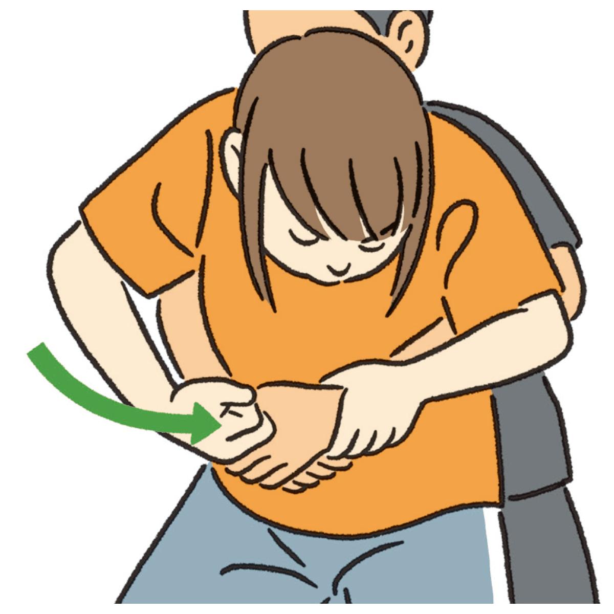 手の甲の中心に痛みのツボがあるので強く突く。相手の手が緩まない場合は、何度も突く。
