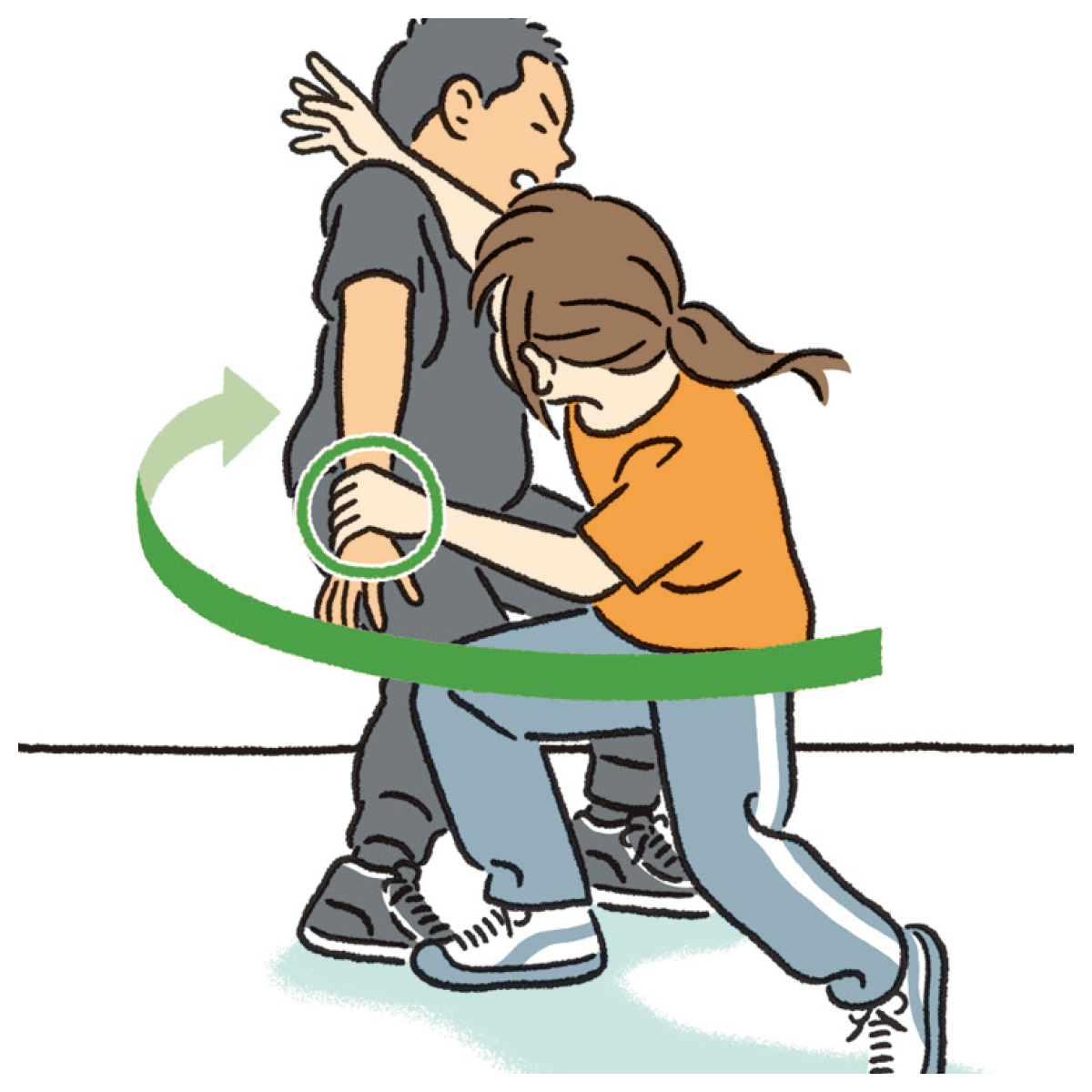 相手の手が緩んだら、左手で相手の右手首を掴み、右足を軸にして相手の横側に回り込む(反対側でもOK)。