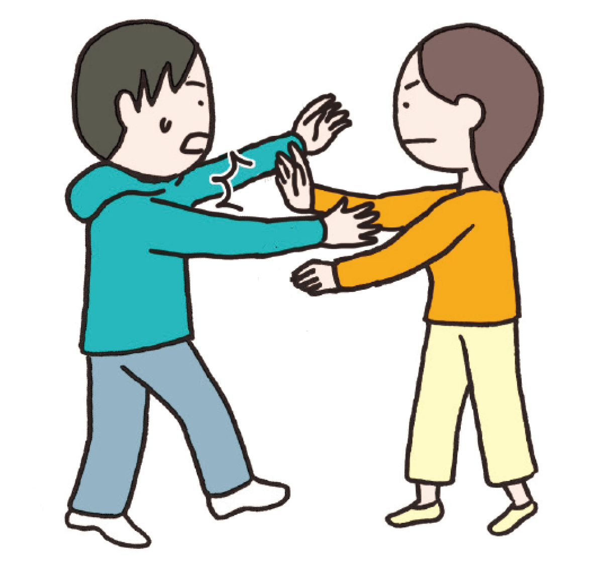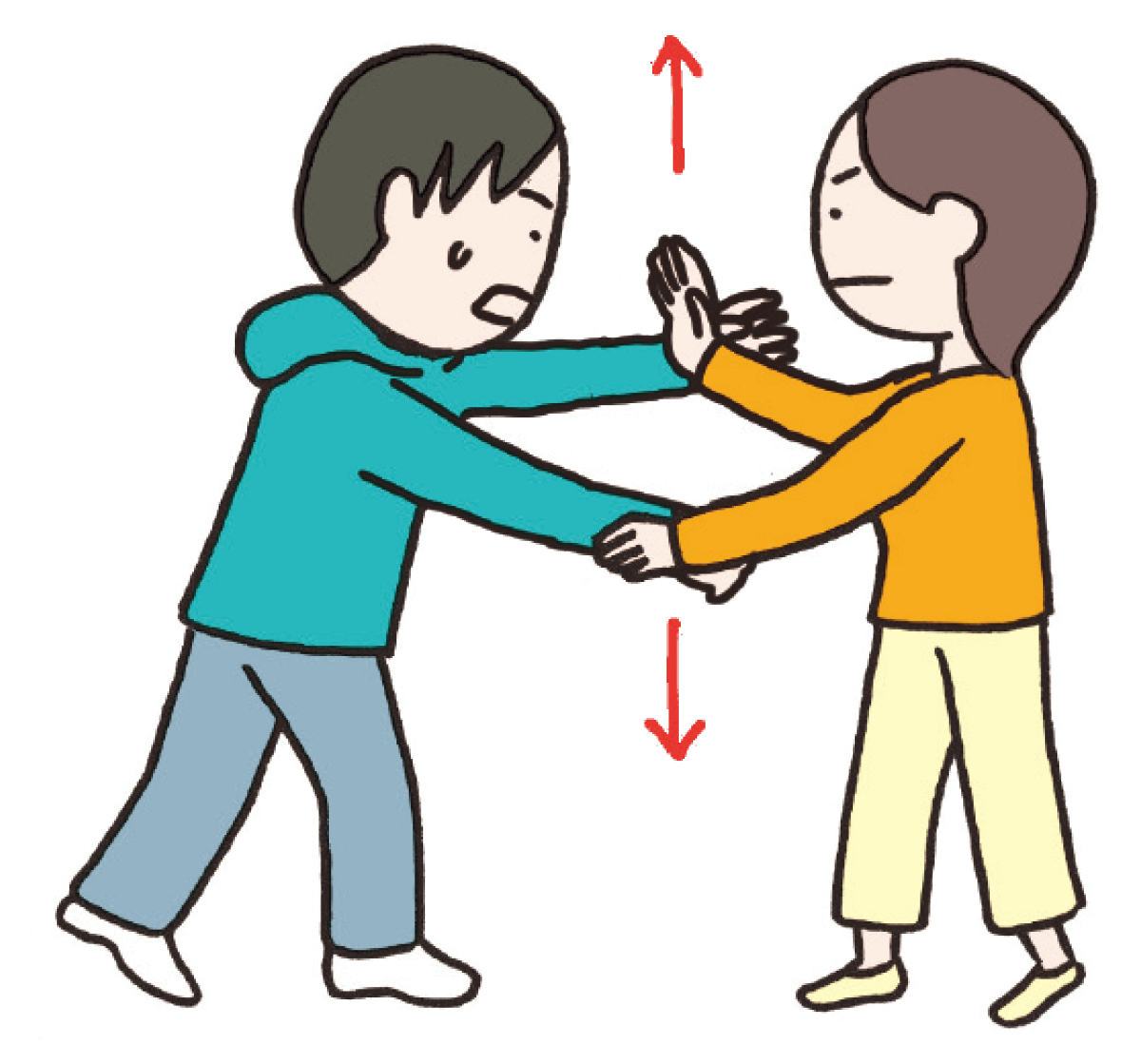 攻撃を察知したら、すばやく両手を前に出します。ひるまず、すぐ行動できるように、日頃から練習しておきましょう。