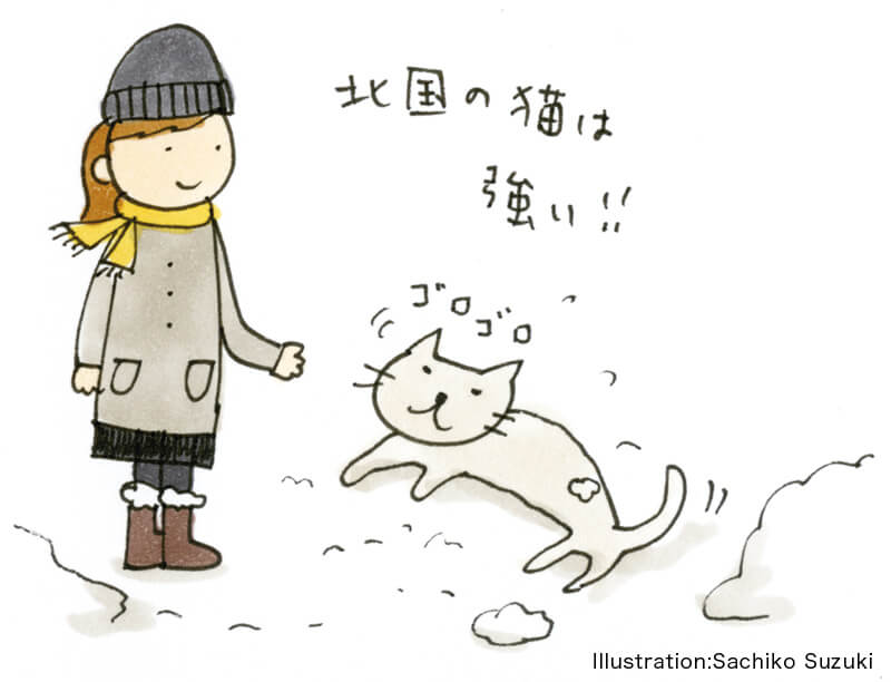 翌日は嘘みたいに見事な晴天。空と雪のコントラストが眩しい。街中を歩くと、ロシア語の看板を至る所に発見。神社は鳥居の半分くらいまで雪で埋まっていて、参拝できない。犬は犬小屋で丸くなり、猫が雪の上で身体をこすりつけて甘えてきた。生まれて初めて食べた「たこしゃぶ」は絶品。この街では当たり前のことが、私にはどれも新鮮で楽しかった。旅の最後は流氷がゴロゴロ浮かんでいる海を横目に、バスで日本最北端の地、宗谷岬へ。「樺太が見えた!」いつの間にか不安は消え、私は今までにない清々しい気持ちで帰路についた。